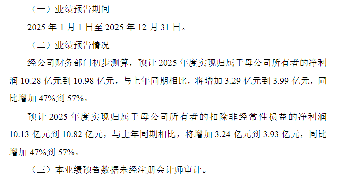 紧随其后,西南证券1月15日发布业绩预告,公司预计2025年度实现归属于母公司所有者的净利润10.28亿元到10.98亿元,与上年同期相比,将增加3.29亿元到3.99亿元,同比增加47%到57%;归属于母公司所有者的扣除非经常性损益的净利润10.13亿元到10.82亿元,与上年同期相比,将增加3.24亿元到3.93亿元,同比增加47%到57%。