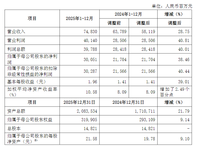 1月14日,中信证券发布业绩快报,公司2025全年实现营业总收入748.3亿元,同比上升28.75%;实现归属于母公司股东的净利润300.51亿元,同比上升38.46%;基本每股收益1.96元,同比上升39.01%。截至2025年年末,中信证券资产总额达20835.34亿元,较2024年末的17107.11亿元增长21.79%。
